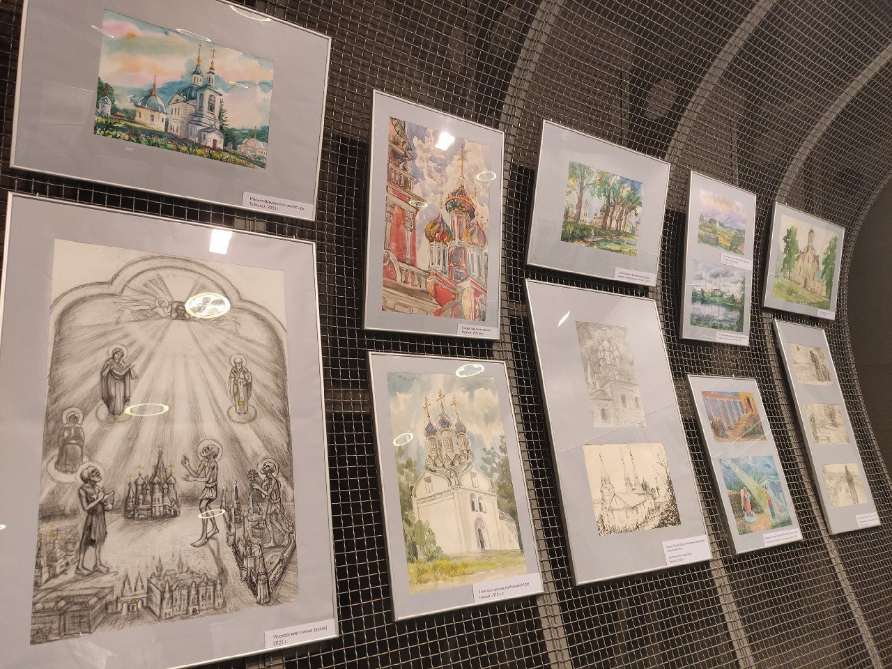 Экспозиция включает около восьмидесяти работ, разделенных на несколько тематических серий — от православия до архитектуры. В своей палитре автор использует акварель, масло, гуашь и графику, демонстрируя виртуозное владение разными техниками.