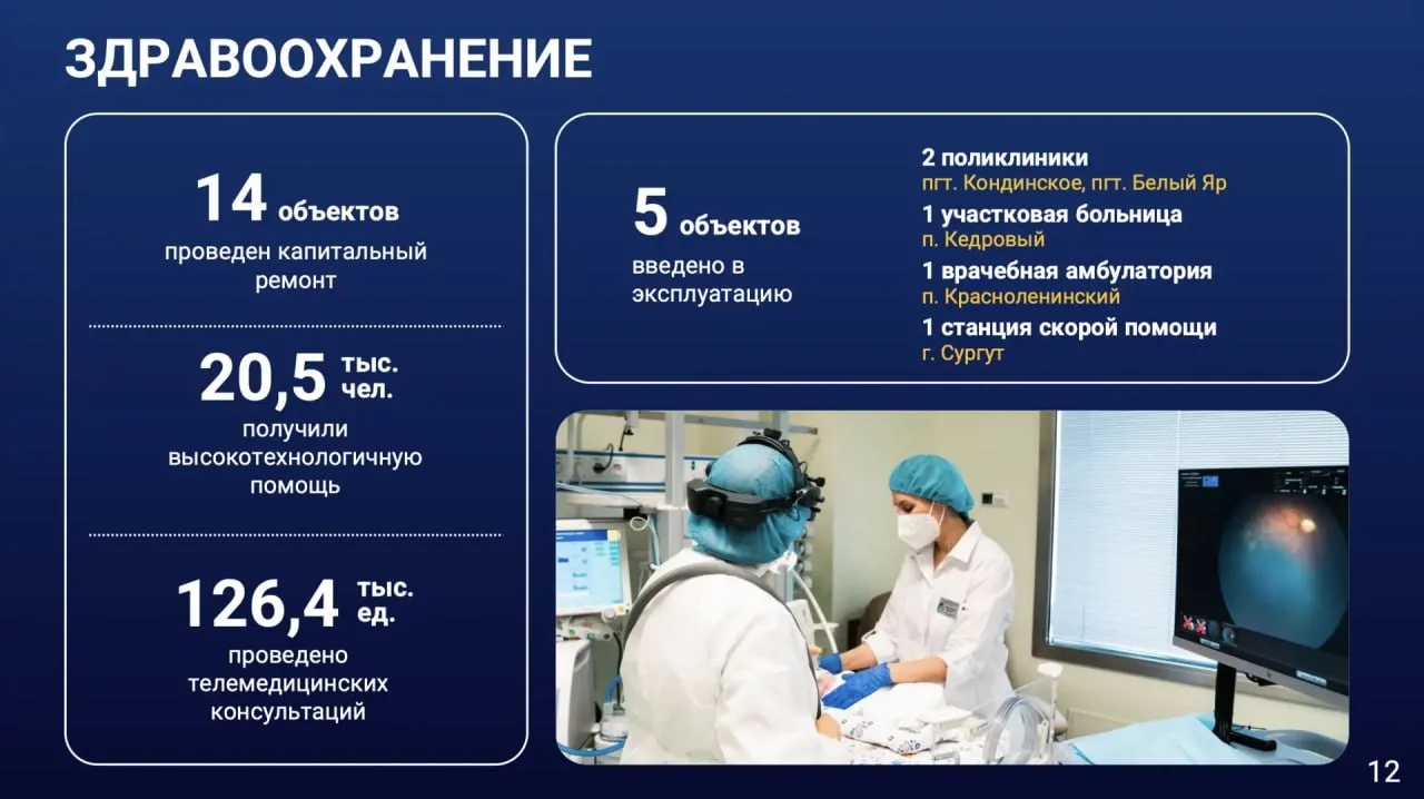 В 2025 году введены в эксплуатацию и начали оказывать медицинскую помощь пять новых объектов – врачебная амбулатория в поселке Красноленинский, участковая больница в поселке Кедровый Ханты-Мансийского района, поликлиники в поселке Кондинское Кондинского района и в поселке Белый Яр Сургутского района, а также станция скорой медицинской помощи в Сургуте.