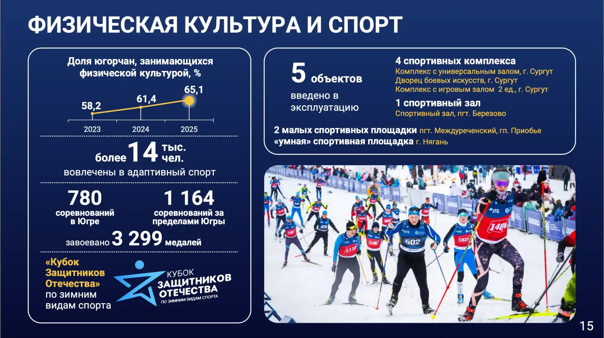 В рамках комплексного подхода к развитию человеческого капитала в Югре особое внимание уделяется популяризации физической активности. Сегодня более 65% югорчан регулярно занимаются физической культурой. Этот результат служит целевым критерием в Стратегии развития физической культуры и спорта в Российской Федерации на период до 2030 года.