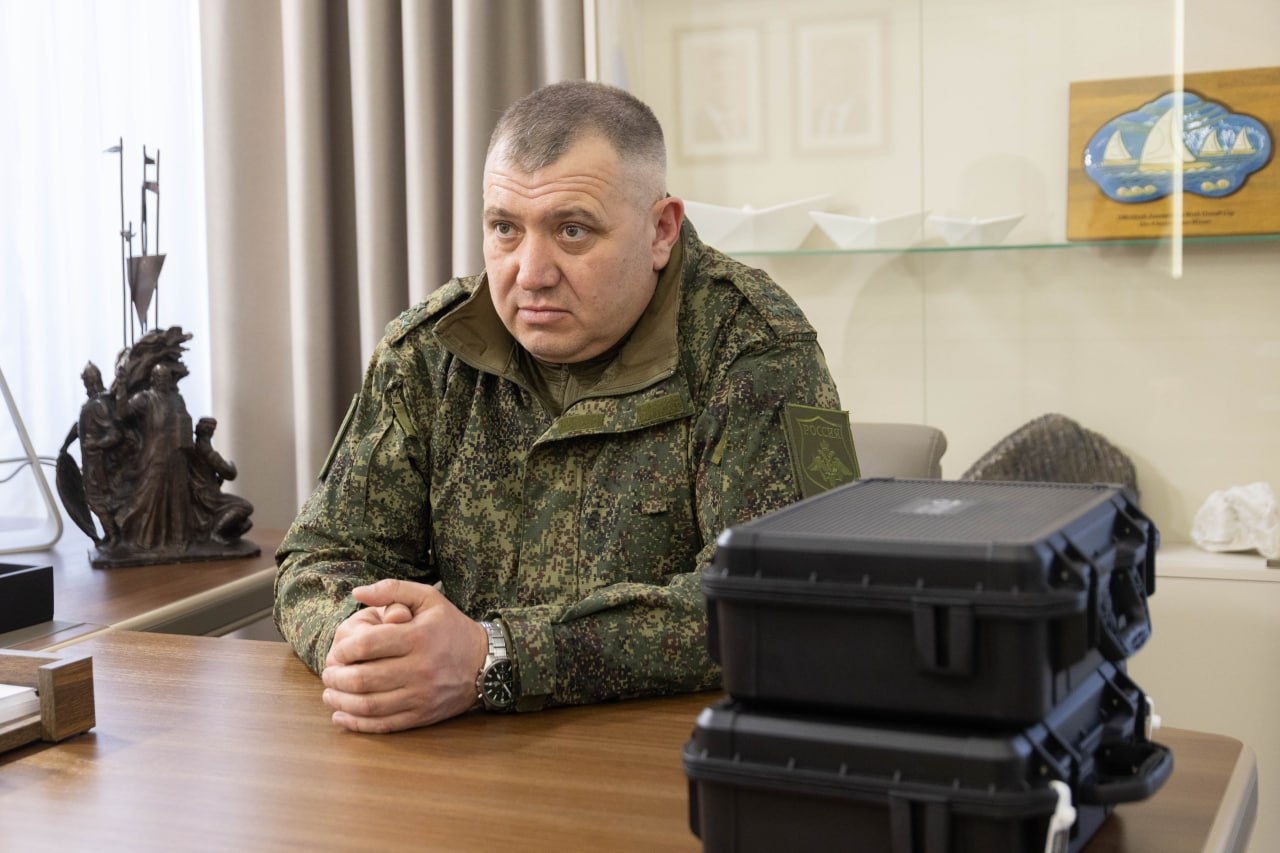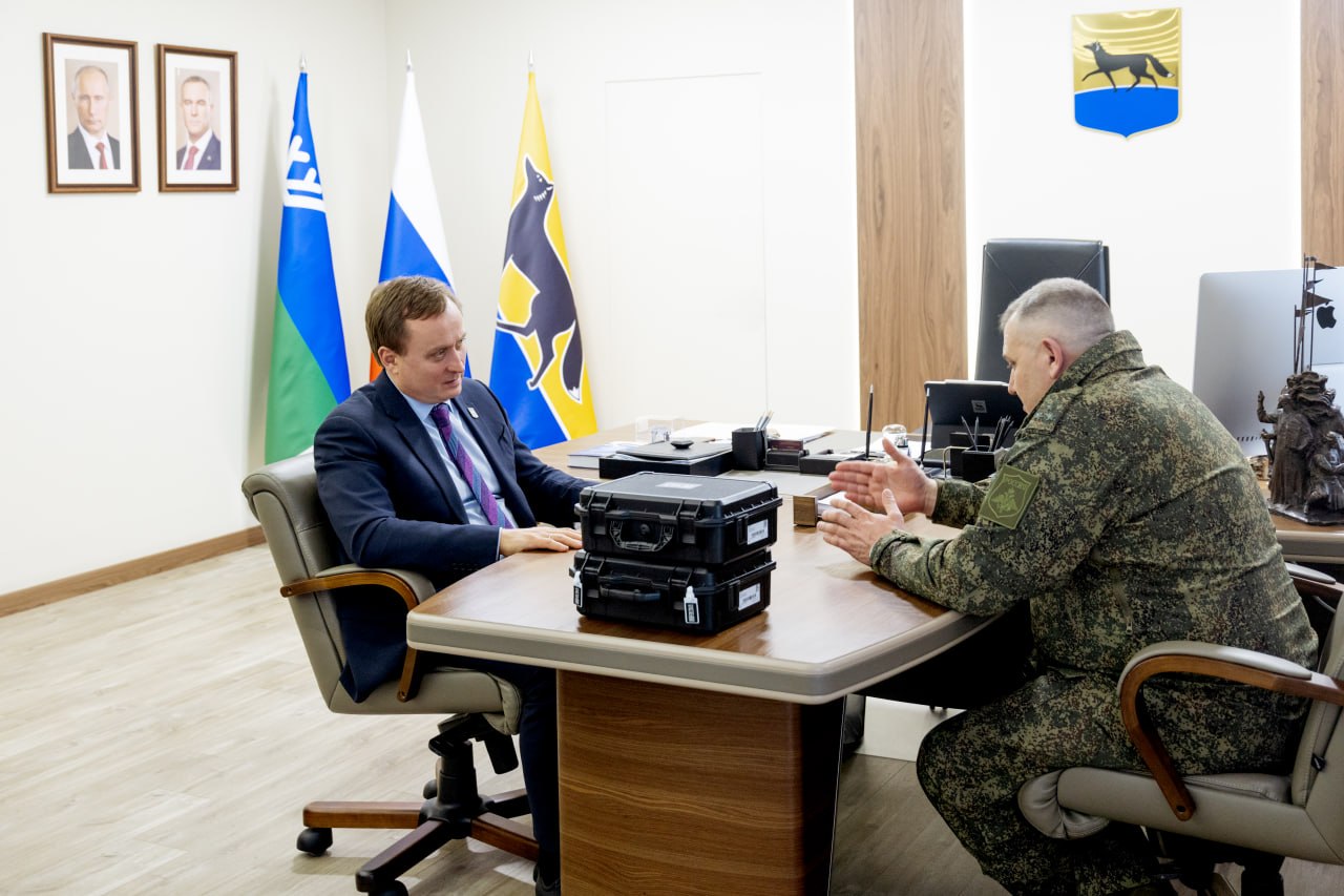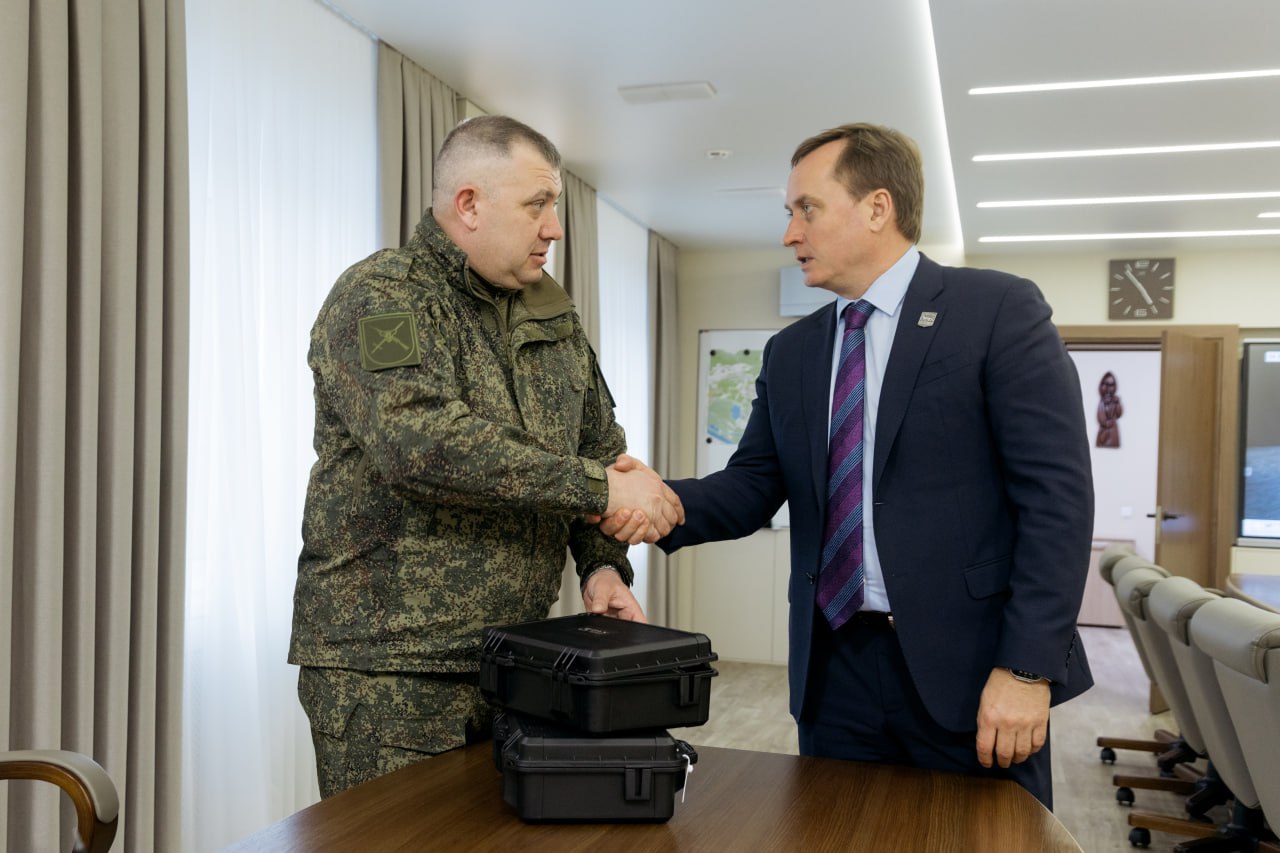 Глава Сургута Максим Слепов вручил командиру мотострелкового полка Виктору Балацану «булаты» – надёжное средство для защиты от дронов.
