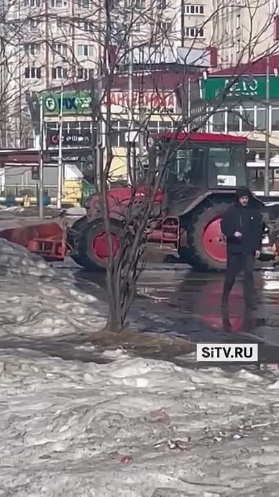 А в Сургуте тем временем тракторы ликвидируют лужи на тротуарах...