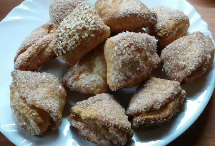 3. Создание слоев. В неглубокую тарелку насыпьте сахар. Выложите кружок теста, немного придавите ладонью так, чтобы сахар прилип к нему. Сложите кружок пополам, сахарной стороной внутрь, и снова прижмите к сахару. Далее повторите процесс, складывая тесто с сахаром внутрь, так вы получите воздушные слои. Одну сторону следует прижать к сахару, а другую — в муке, чтобы печенье не пригорело при выпечке.