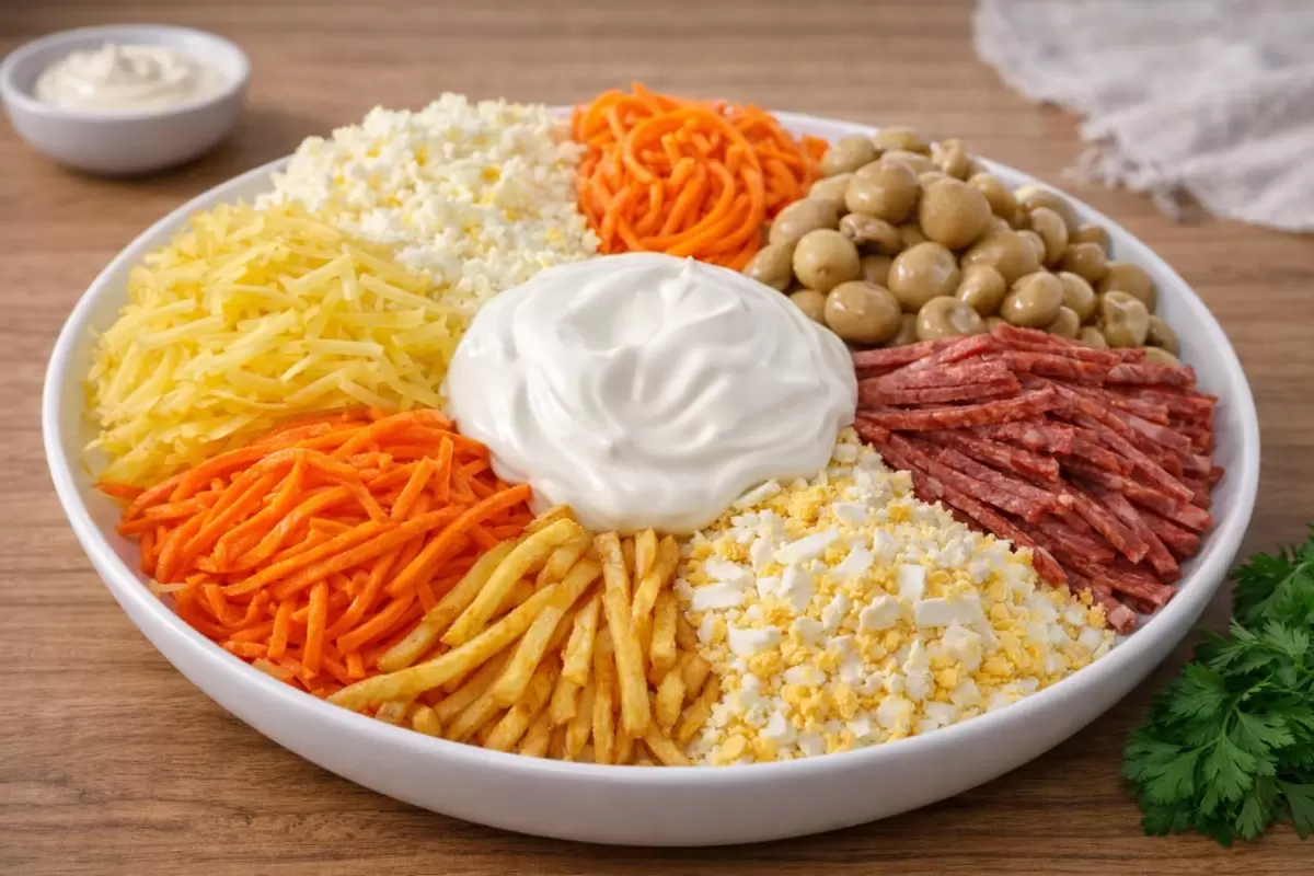 Приготовление начинается с подготовки ингредиентов. Вареные яйца нарезают кубиками, твердый сыр натирают или нарезают тонкими ломтиками. Сервелат также подвергается нарезке и, при необходимости, маринованные шампиньоны делят, если они крупные. Картофель фри можно использовать как готовый, так и свежеприготовленный. Корейскую морковь желательно укоротить для удобства.
