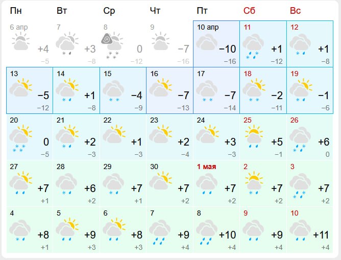 Теплеть начнёт в 20-х числах апреля: в начале декады температура может поняться до +2°С, к концу — до +7°С.