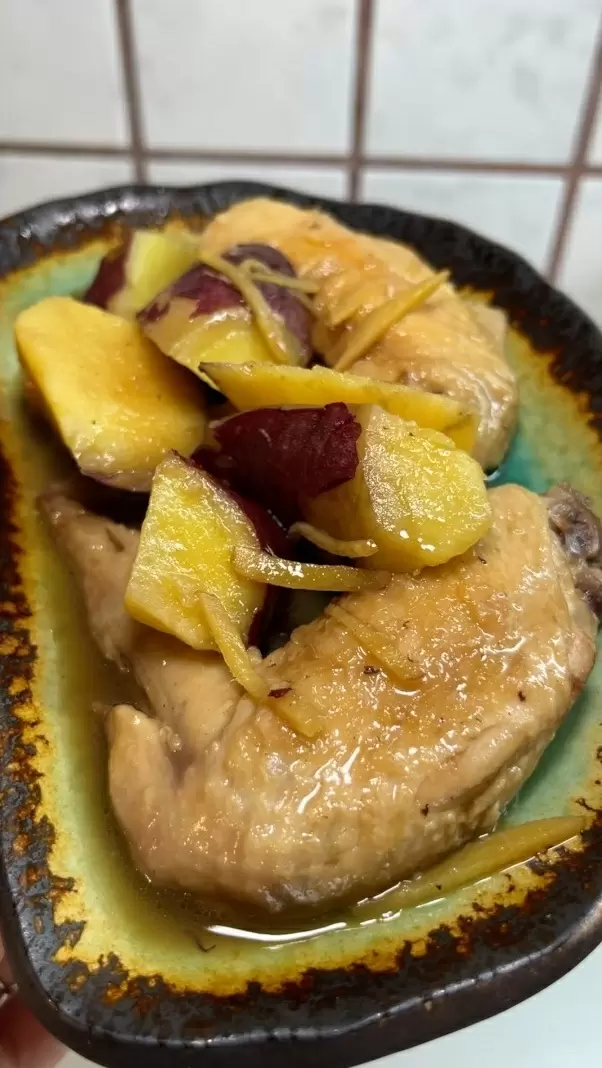 Батат режут на небольшие кусочки, имбирь нарезают соломкой, а крылья обжаривают до красивой золотистой корочки.