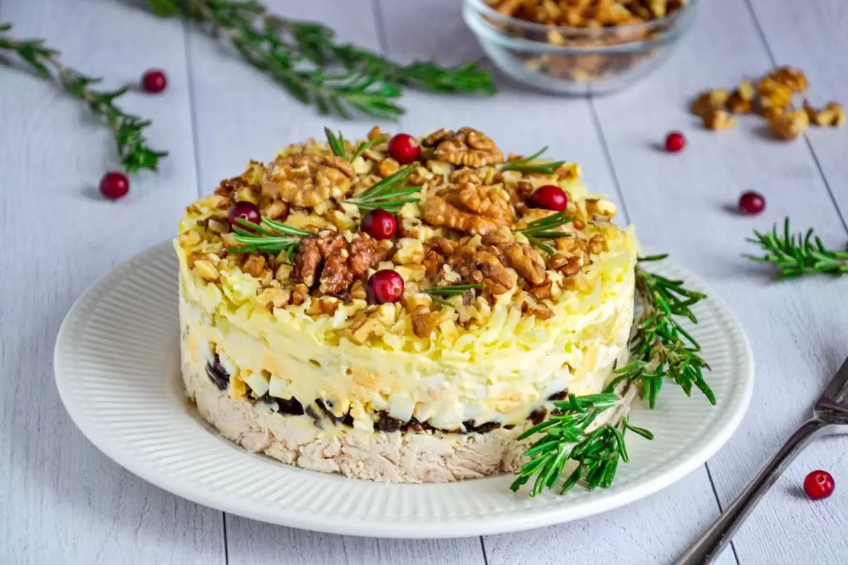 Салат с курицей, черносливом и грецкими орехами — это не только вкусное, но и красивое блюдо, которое станет настоящим украшением любого стола и обязательно порадует гостей.