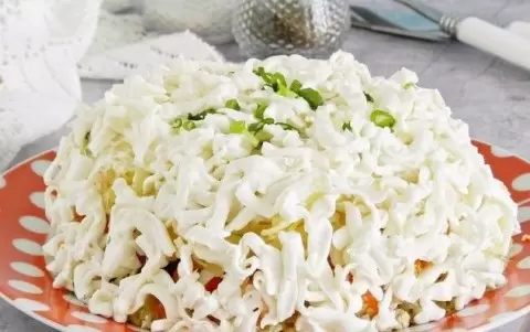 Далее на огурец выкладывается слой моркови, который также смазывается майонезом. Процесс повторяется с яйцом: еще один слой натирается и приправляется солью, перцем и майонезом. Завершающим этапом станет натертый картофель, оставшийся зеленый лук и немного майонеза. В финале натертый плавленый сыр выкладывается сверху и по бокам салата, придавая ему аппетитный вид.
