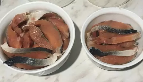Размер порционных кусочков должен составлять примерно 1 см в толщину. Если хочется поэкспериментировать с вкусом, подойдет следующий подход к засолке: