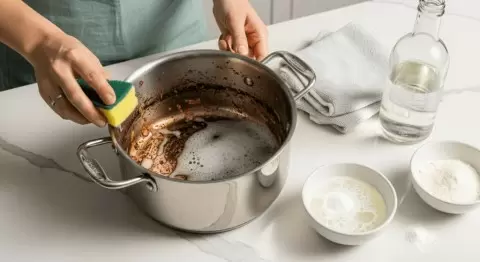 - Подготовка: Удалите крупные куски пригоревшей пищи, затем наполните кастрюлю теплой водой с добавлением нескольких капель моющего средства. Оставьте на 1-2 часа для размягчения загрязнений.