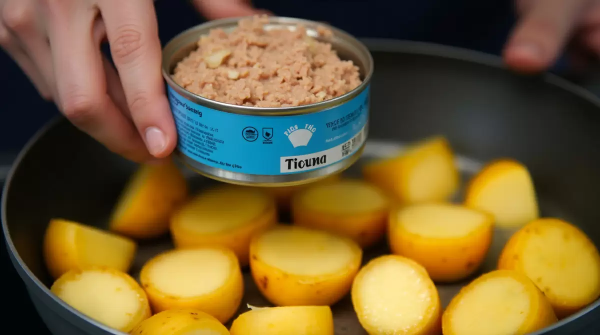 Овощную массу разминают, добавляют соль и перец по вкусу. Не нужно волноваться, если останутся мелкие кусочки – они добавят текстуры готовому блюду. Далее добавляют взбитое яйцо и тщательно перемешивают. С консервированным тунцом происходит следующее: его слегка разминают вилкой и добавляют в картофельную смеси, что придаст блюду необычный вкус и делает его питательнее.