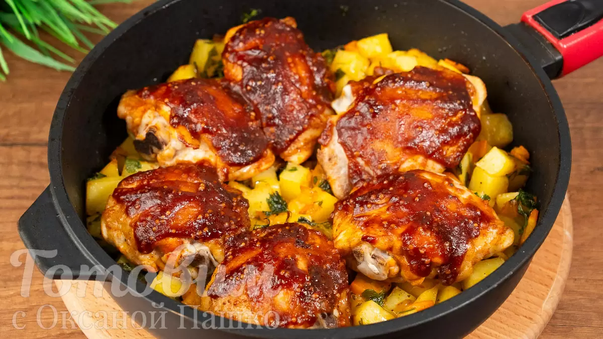 Соус: 100 мл томатного соуса, 30 мл соевого соуса, столовая ложка яблочного уксуса, горчицы и сахара. Процесс приготовления начинается с маринации курицы, а затем – жарки овощей с куриными бедрышками, которые запекаются под соусом в духовке. Готовое блюдо порадует всех за столом своей сочностью и вкусом.