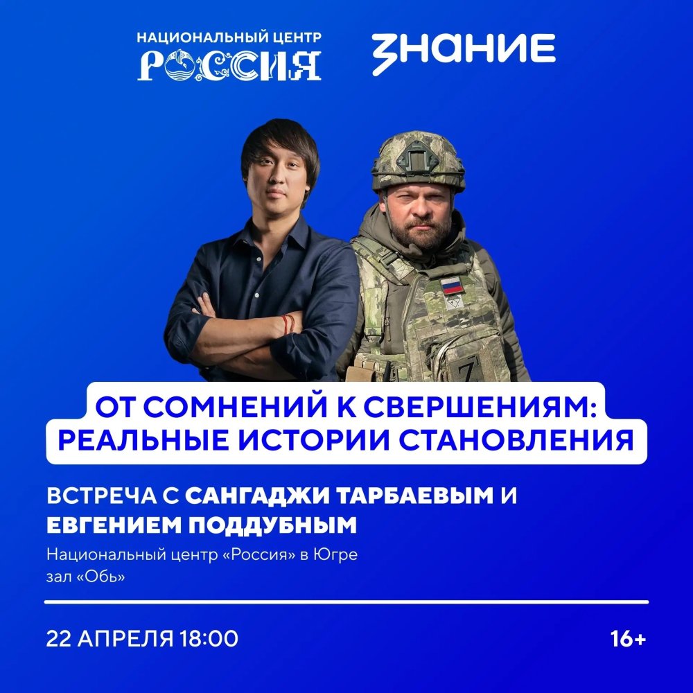 В филиале НЦ «Россия» в Ханты-Мансийске пройдет мотивационная встреча «От сомнений к свершениям: реальные истории становления». Гостями станут два человека: Евгений Поддубный — военный корреспондент ВГТРК, Герой России, и Сангаджи Тарбаев — председатель комитета Государственной Думы по туризму и развитию туристической инфраструктуры. Место встречи: 22 апреля в 18:00, Национальный центр «Россия». Мероприятие бесплатное, возрастное ограничение — 16+. Регистрация на сайте НЦ «Россия».